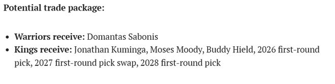 国王队得到:库明加、穆迪、希尔德、2026年首轮签、2027年首轮签互换权、2028年首轮签