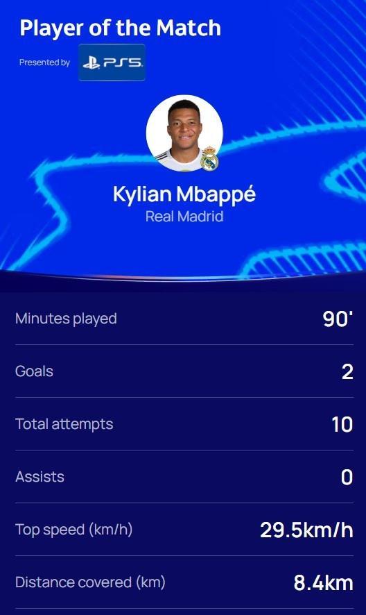 点射双响!欧冠官方:法国前锋姆巴佩当选皇马vs马赛全场最佳